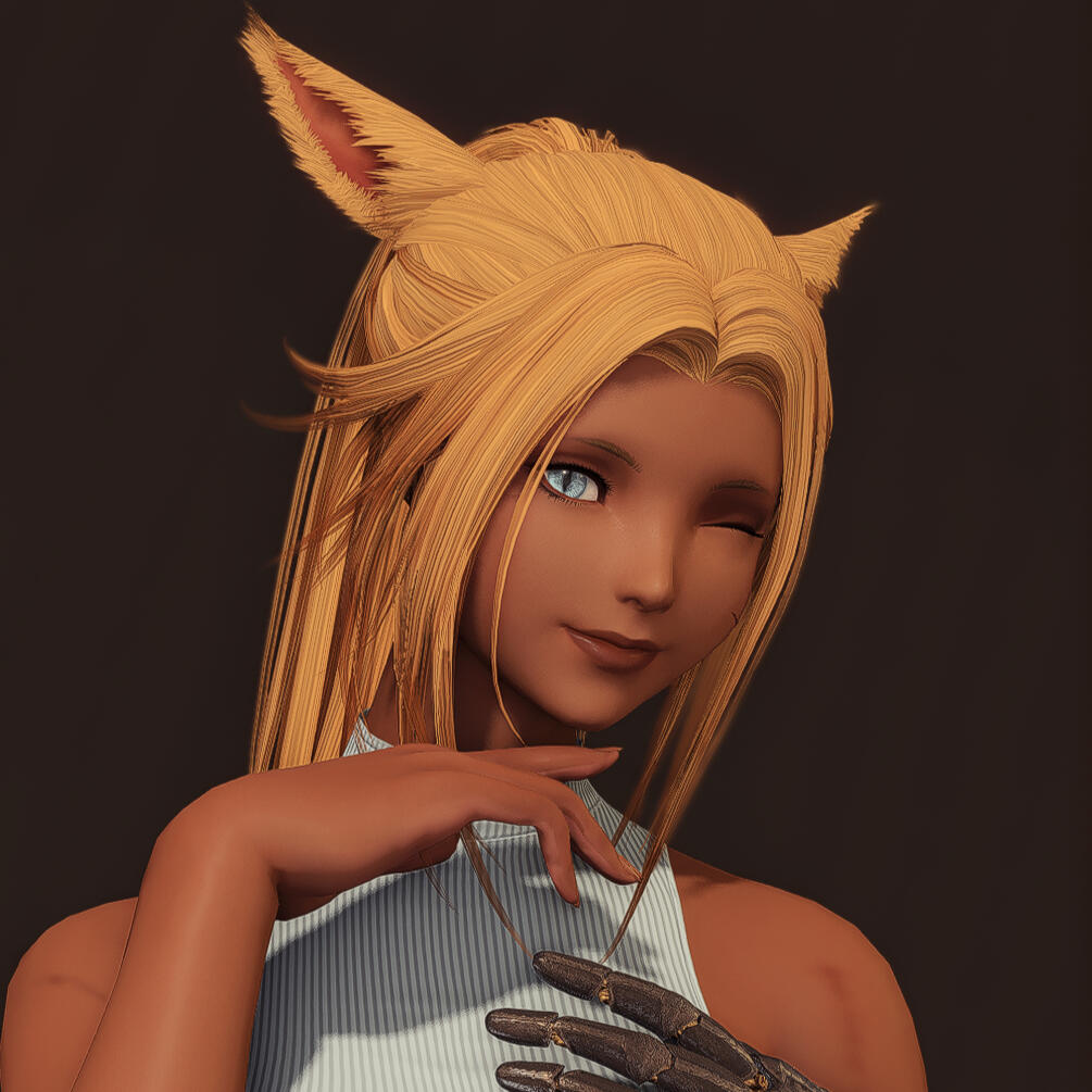Born in the northern borders of Shaaloani, where the woods were dense and fauna green, Awinita grew up with a tribe of traditional, hunting Hhetsarro. She was born not versed in magic, having little to no ability to use Aether, so she found it difficult to contribute to the tribe in the same ways as others. She could not heal, she could not cast spells - she could not summon the earth or stars to help her tribe.Though she was very well versed with a bow, her aim next to perfection, growing up she still struggled to keep up with her magically inclined peers.So when, slowly over time, man and machine seemed to broach the shores of the New World, an interest peaked in the young kit. Where she lacked in magic, she found a talent with machines, and seemed to understand their nature as well as mages knew the lifestream.Since gaining this inquisitive nature, Nita realised that the comfortable traditional life was not for her. Living off the land like her parents and her family was not the life that would bring her happiness, and so - she left. Ending up in the care of a not-so-rough and tumble gang is where she began to nurture her curiosity with machines, and though they are often breaking the law, these people are her family.Her personality is a mix, depending on how friendly she may be with you. More often than not she's a little clumsy, head full of too many ideas, and unwilling to stop. It's easy for her to forget to eat, sleep, and everything in between when working on a new idea. And she may or may not throw a wrench at you if you interrupt her. She is, also, incredibly kind and lively when not buried in ideas. The things she likes to make are to help people - to make their lives better, their jobs easier, or just something fun they may enjoy.