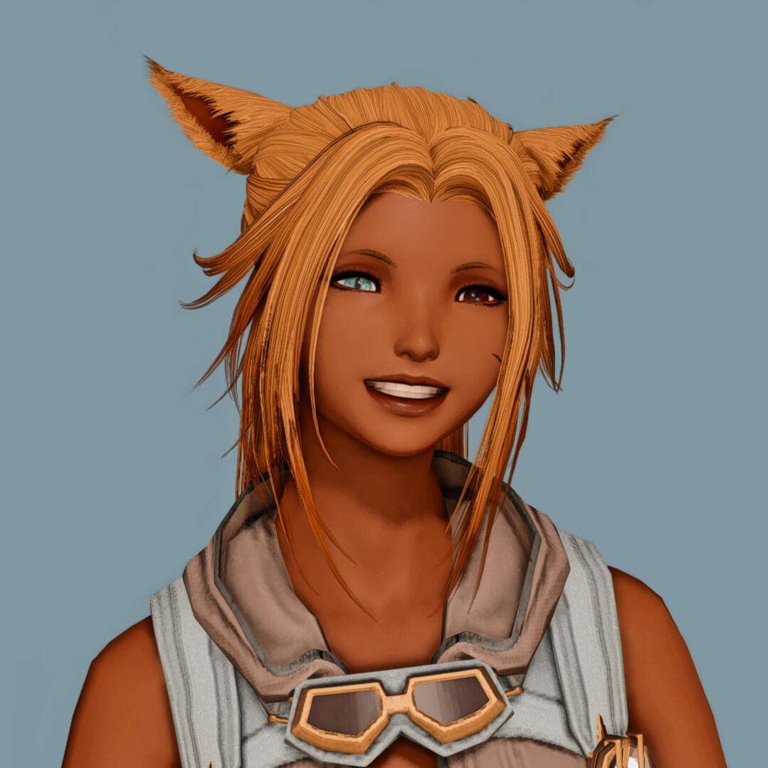 Born in the northern borders of Shaaloani, where the woods were dense and fauna green, Awinita grew up with a tribe of traditional, hunting Hhetsarro. She was born not versed in magic, having little to no ability to use Aether, so she found it difficult to contribute to the tribe in the same ways as others. She could not heal, she could not cast spells - she could not summon the earth or stars to help her tribe.Though she was very well versed with a bow, her aim next to perfection, growing up she still struggled to keep up with her magically inclined peers.So when, slowly over time, man and machine seemed to broach the shores of the New World, an interest peaked in the young kit. Where she lacked in magic, she found a talent with machines, and seemed to understand their nature as well as mages knew the lifestream.Since gaining this inquisitive nature, Nita realised that the comfortable traditional life was not for her. Living off the land like her parents and her family was not the life that would bring her happiness, and so - she left. Ending up in the care of a not-so-rough and tumble gang is where she began to nurture her curiosity with machines, and though they are often breaking the law, these people are her family.Her personality is a mix, depending on how friendly she may be with you. More often than not she's a little clumsy, head full of too many ideas, and unwilling to stop. It's easy for her to forget to eat, sleep, and everything in between when working on a new idea. And she may or may not throw a wrench at you if you interrupt her. She is, also, incredibly kind and lively when not buried in ideas. The things she likes to make are to help people - to make their lives better, their jobs easier, or just something fun they may enjoy.